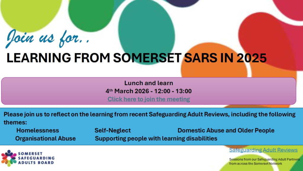 Please join us to reflect on the learning from recent Safeguarding Adult Reviews, including the following themes: Homelessness Self-Neglect Domestic Abuse and Older People Organisational Abuse Supporting people with learning disabilities