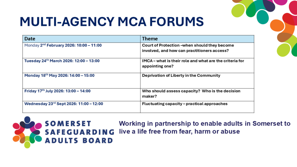 The sessions will be 1 hour long and consist of a short 15-minute presentation around a number of identified themes. The primary aim of the sessions is to provide a forum where practitioners can discuss situations that they face on the ground with implementation of the Act. As such the presentations are to stimulate discussion, not limited to the theme of each session. The aim of the sessions is that they will be practitioner led with a focus on practical ways to improve MCA skills and competencies.